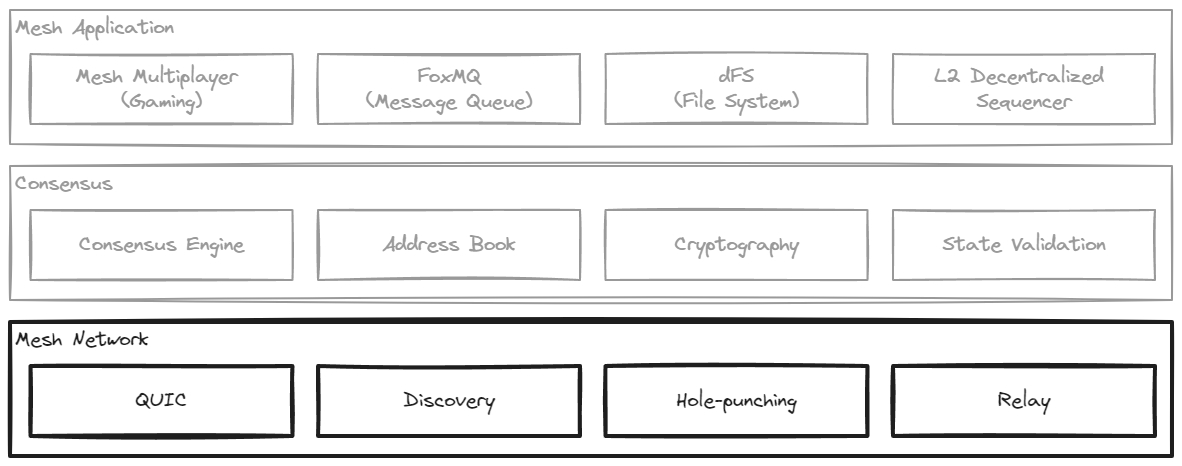 A mesh network (or MeshNet or mesh net) is a network of peer computers using Tashi consensus engine to power mesh applications. The network layer of the Tashi stack is responsible for the network transport, peer discovery and handshaking, network traversal (including hole-punching), and a relay to support scenarios where the network doesn't allow for pure peer-to-peer connectivity.