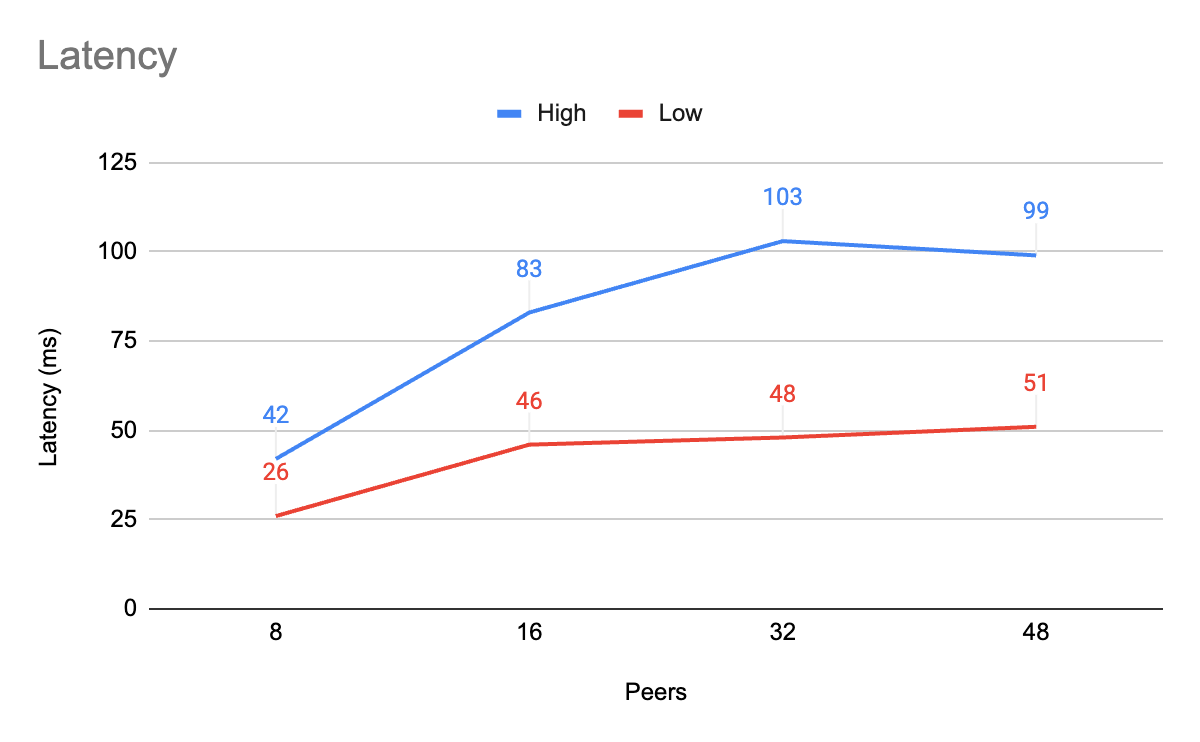 The results showed latency as low as 26ms with 8 peers and as high as 103ms with 32 peers. Not shown on the graph is that the average throughput with this configuration was between 262,000 - 289,000 TPS for all peer counts. More peers slightly increases the throughput, but where most games only require between 60-120 TPS x the number of peers, Vertex provides almost an order of magnitude of headroom for TPS.